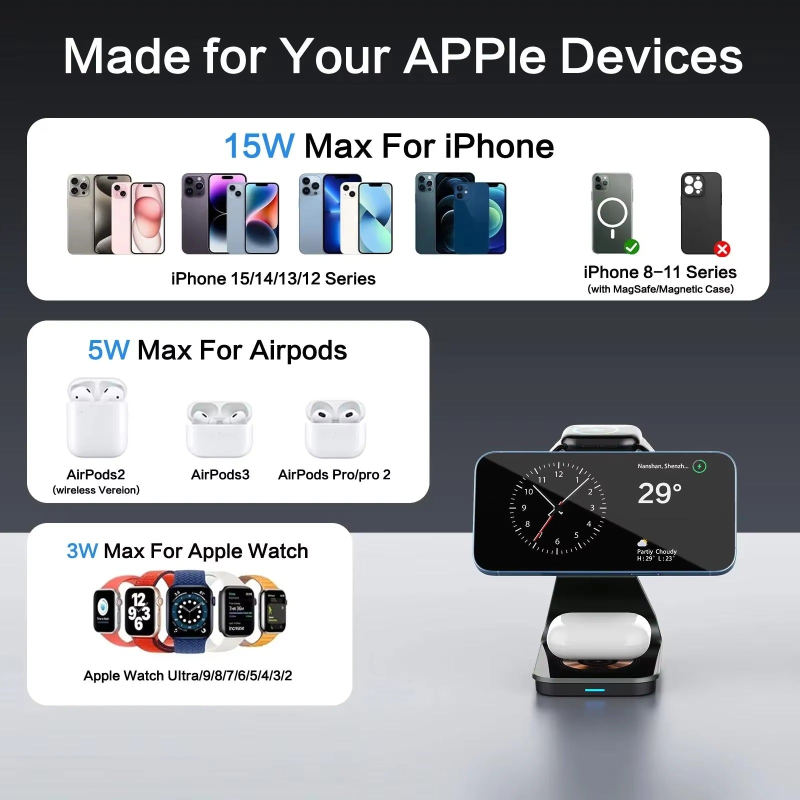 - Magnetic Design: Strong dual magnetic suction for iPhone and Apple Watch charging.