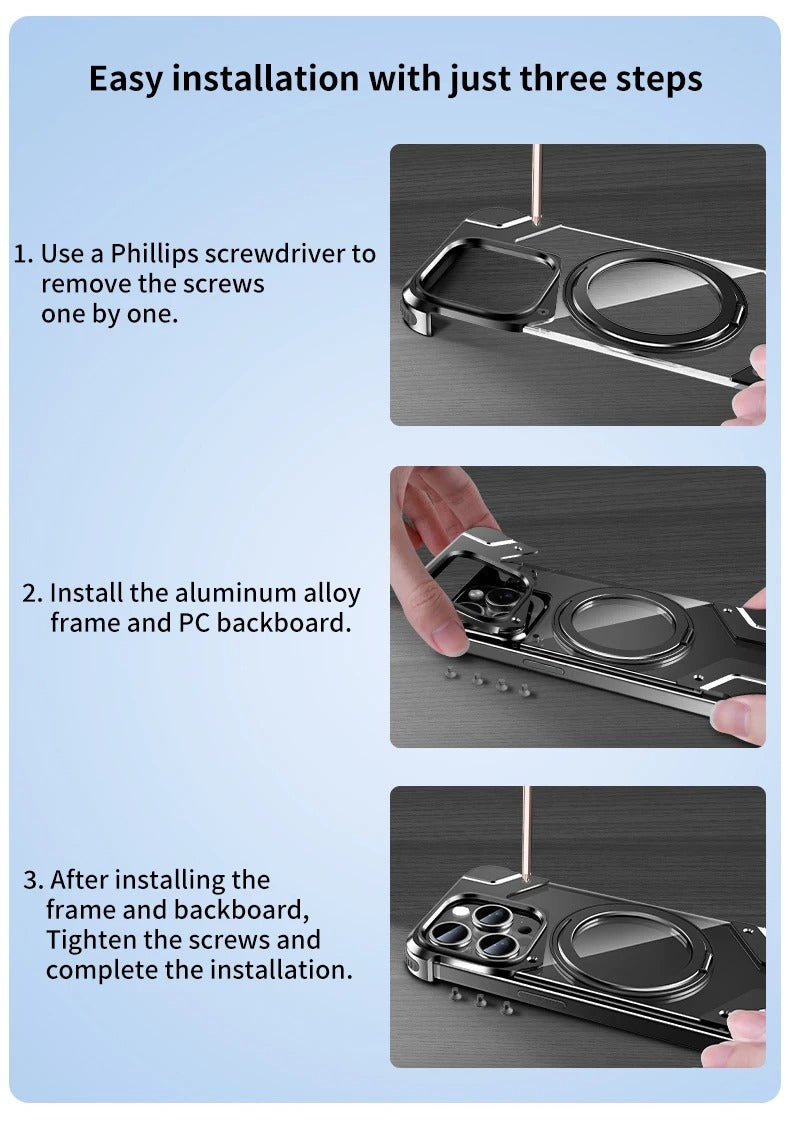 The Luxury Apple iPhone Case features a CNC-machined aluminum alloy frame with a transparent PC back, providing complete edge-to-edge protection while preserving your phone’s original aesthetic. The 360° rimless design keeps the case ultra-light and breathable, while the foldable built-in bracket transforms into a stable kickstand for hands-free use.