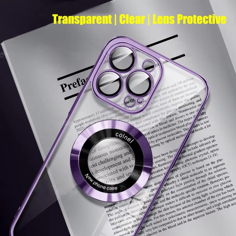 The Luxury Apple iPhone Case features a transparent TPU body with electroplated edges, combining a polished metallic look with the flexibility and protection of silicone. A built-in magnetic ring ensures flawless MagSafe wireless charging and magnetic accessory support.