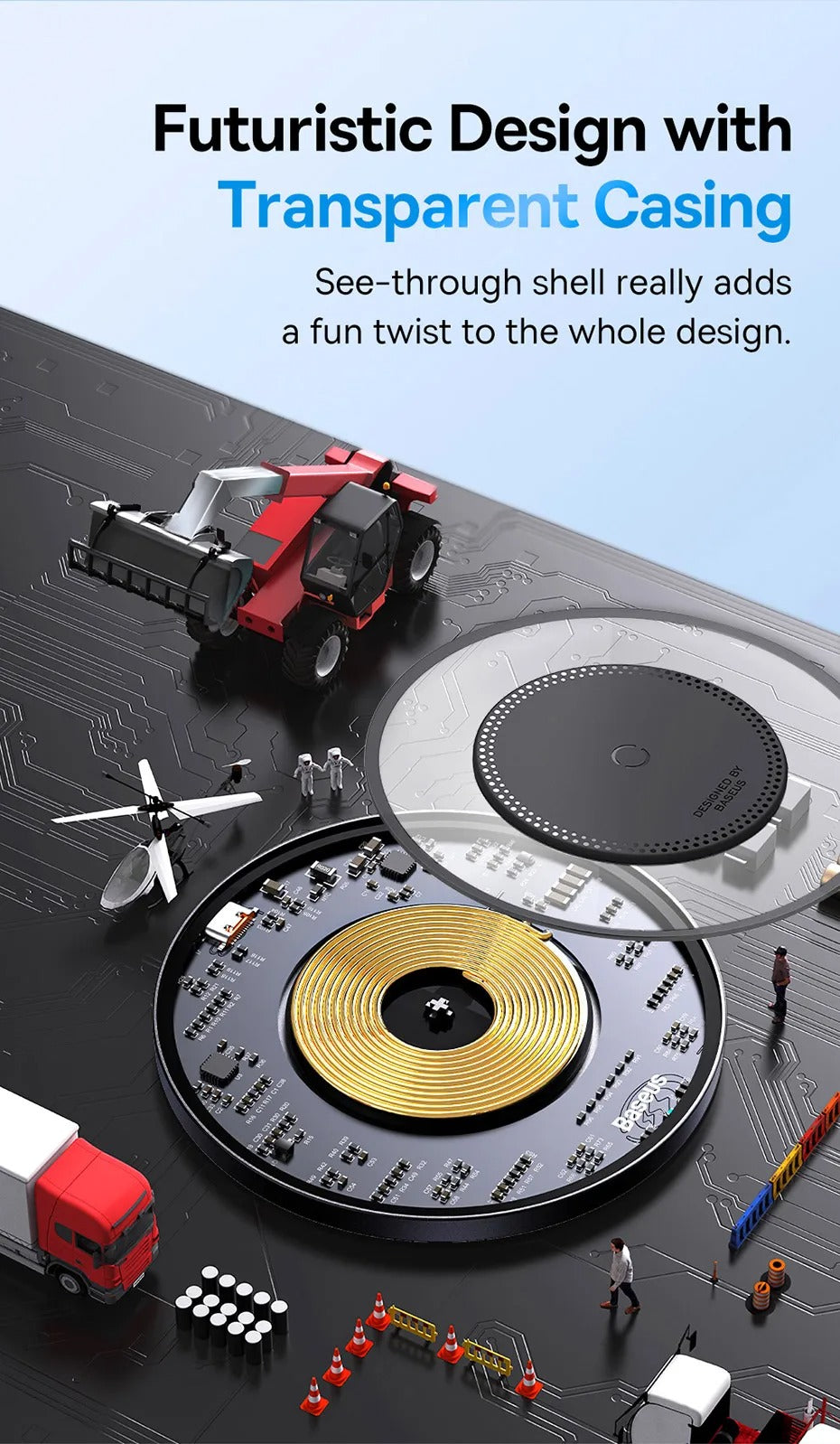 This charger is more than a gadget—it's a statement piece. Its ultra-thin form factor and see-through design let you see the precision engineering underneath, while the glowing indicator adds a futuristic touch to your desk.