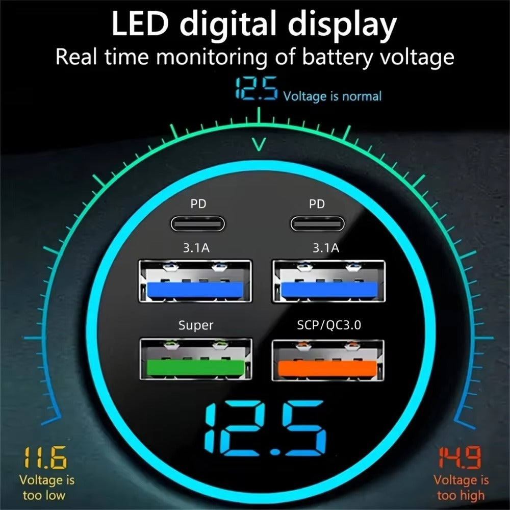 Premium 250W USB Car Charger with Digital Display – 6-Port Fast Charging PD QC3.0 Type-C Adapter, Intelligent Protection, Quick Charge