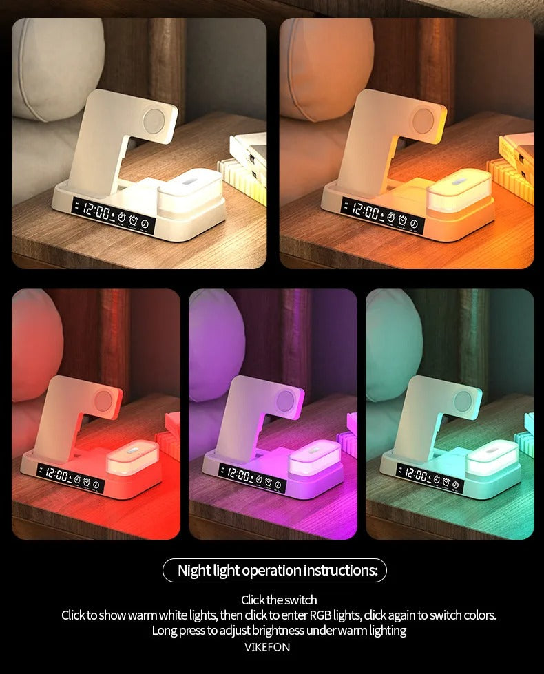 The Premium 3 in 1 Wireless Charging Station solves these problems with a powerful 30W output, built-in alarm clock, and detachable RGB night light.