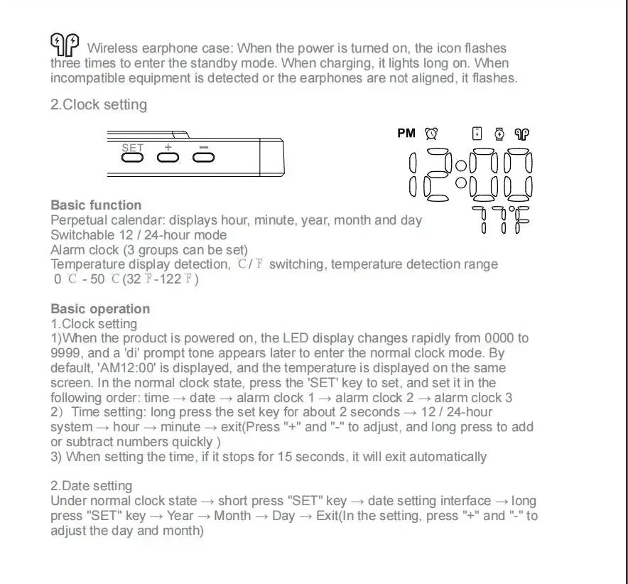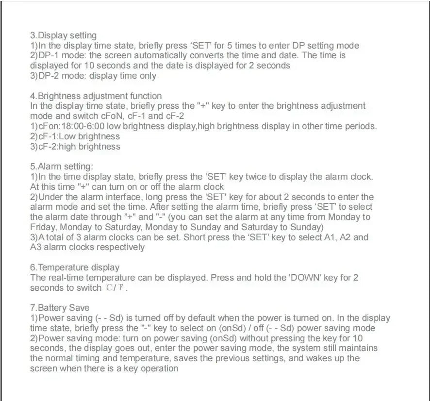 - Display Functions: Time, date, temperature (℃/℉), perpetual calendar, and three alarms.