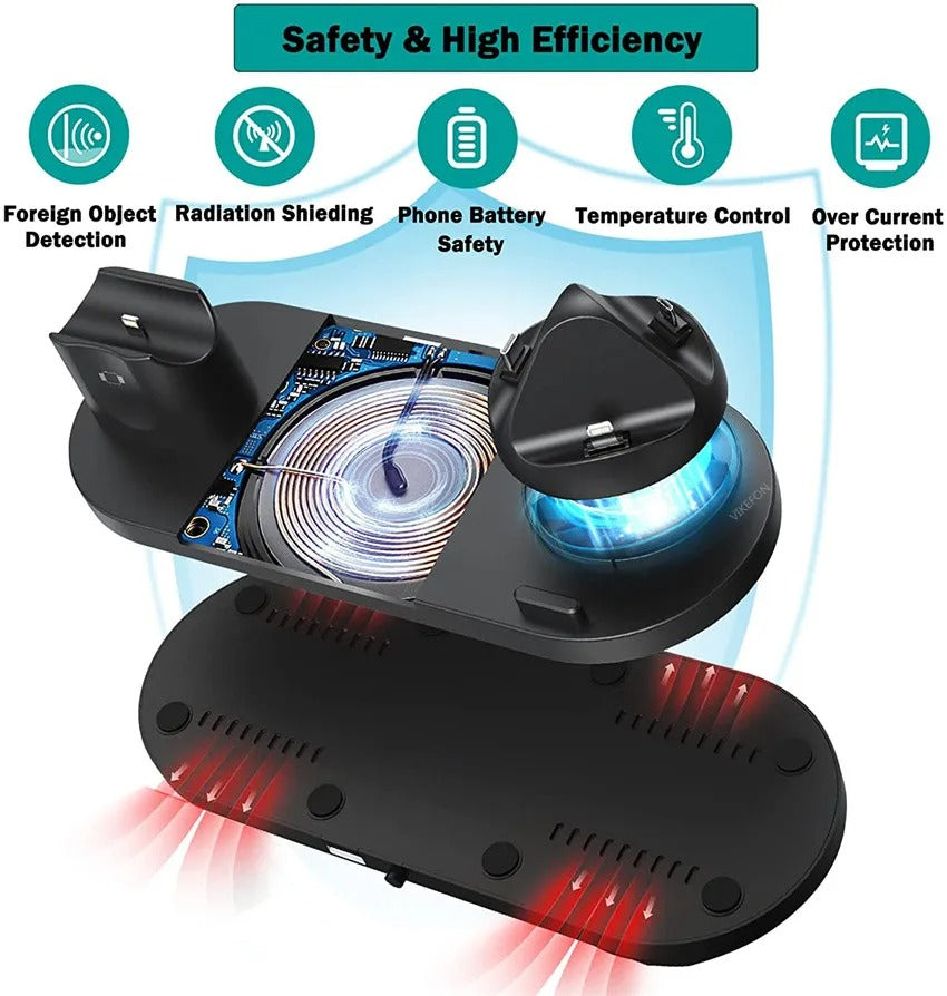 Premium 6 in 1 Wireless Charging Station – Fast Charger Dock for iPhone, Apple Watch, AirPods with Type-C, Lightning & Micro USB Ports, 15W Output