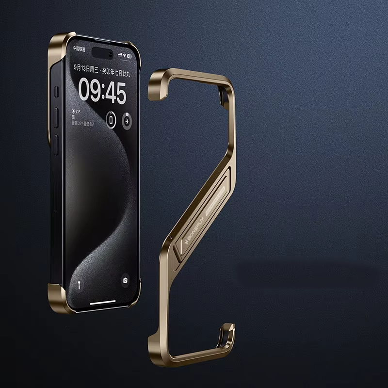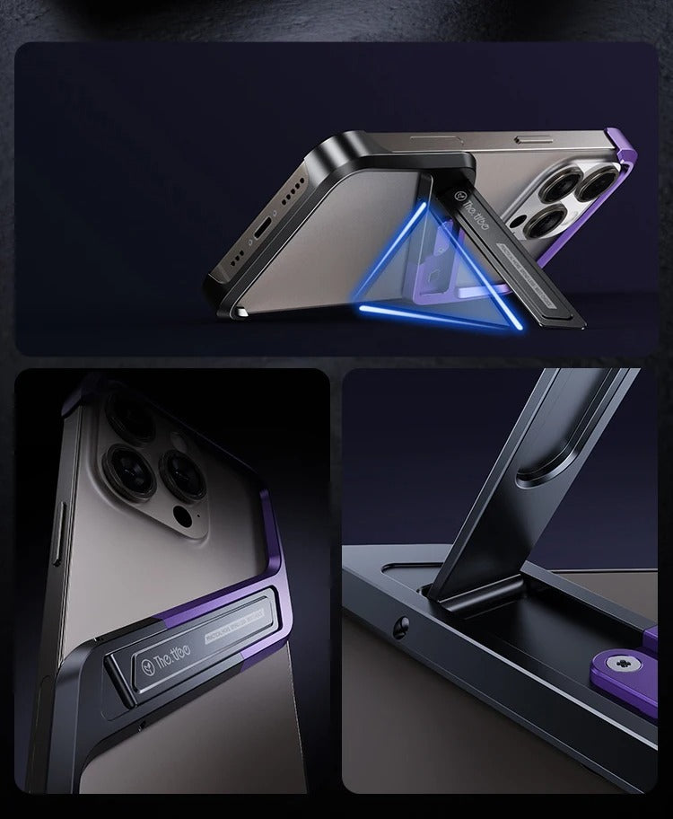 The Premium Apple iPhone Case features a rimless aluminum S-type frame for minimalist edge protection, combined with a ventilated back shell that promotes active heat dissipation during heavy phone use. The invisible built-in stand folds seamlessly into the frame, offering a hands-free viewing experience when needed without adding extra bulk.