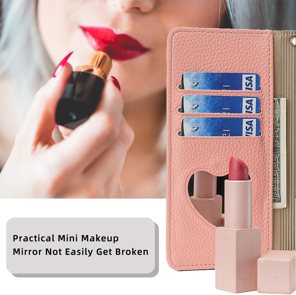 - Design: Flip wallet case with a stylish built-in mirror for quick touch-ups.